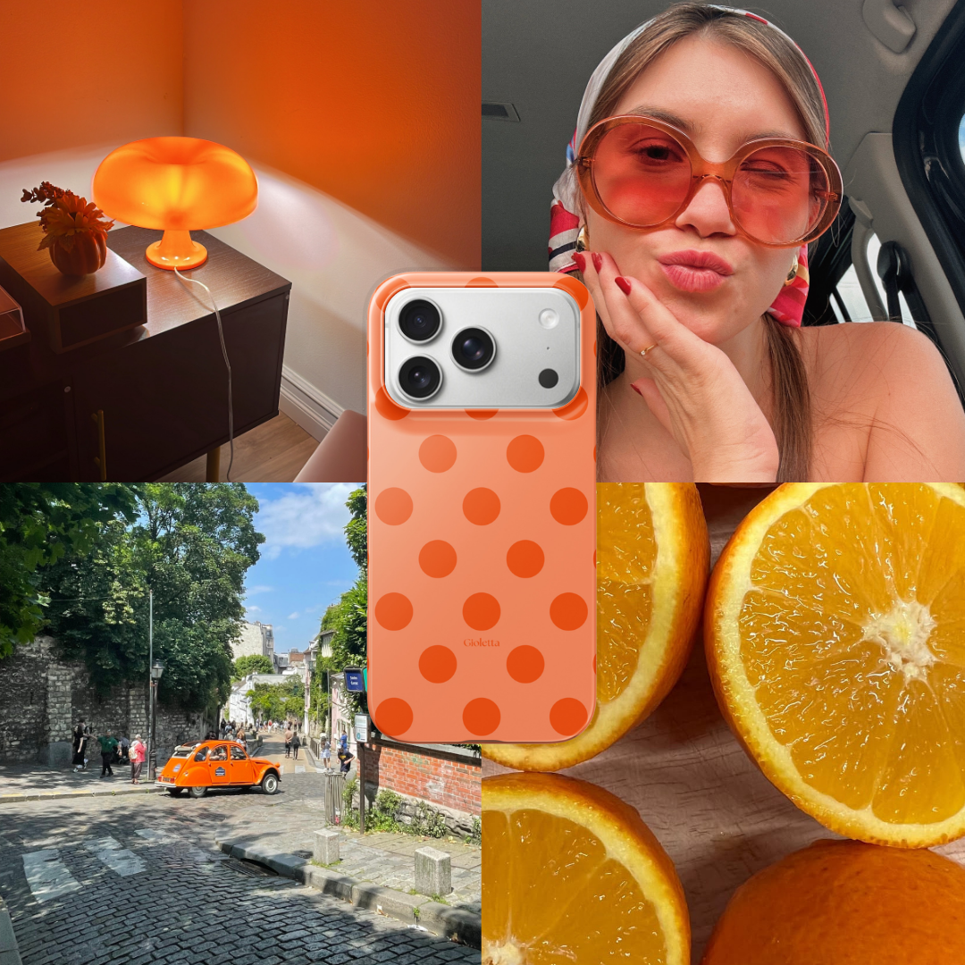 Soft pastel orange sets the base while vibrant orange polka dots add a playful, sunny touch. Fresh, bold, and effortlessly iconic, made to brighten your everyday look.